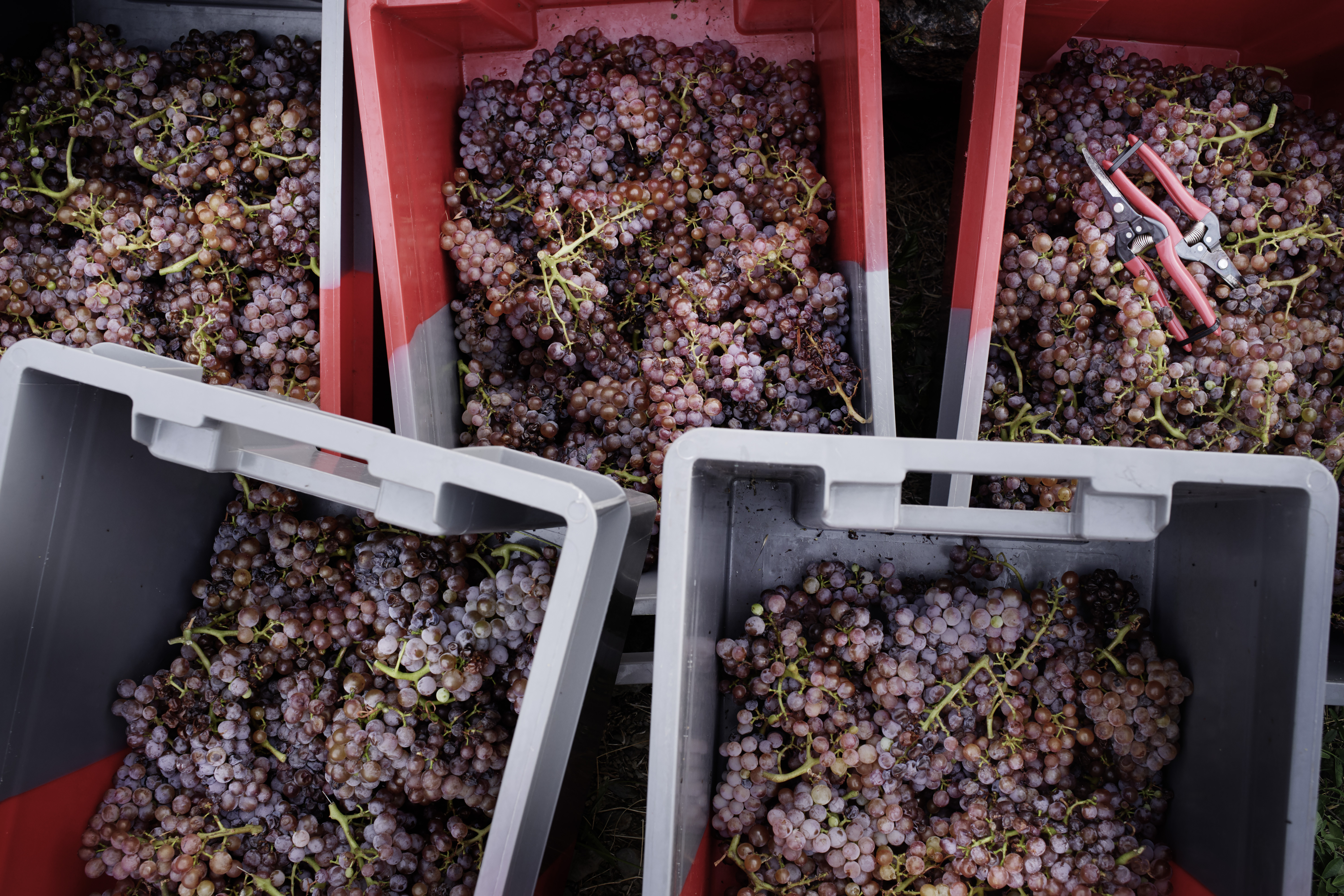 Knapp 98 Kilo ernten wir, wunderbar gesunde Früchte. Sofort nach der Ernte bringen wir die Trauben in unsere kleine Höhle, wo wie sie entrappen und quetschen. Mit Hilfe von Trockeneis kühlen wir die Maische, verschliessen den grossen Bottich und lassen die Maische einige Stunden ruhen. Da wir im Freien pressen werden, müssen wir die nächste Nacht abwarten, um so die kühleren Temperaturen ausnützen zu können. Ausserdem extrahieren wir durch die Standzeit etwas Farbe und Gerbstoffe, was dem Aroma des Lledoner Roig zugute kommen könnte.
