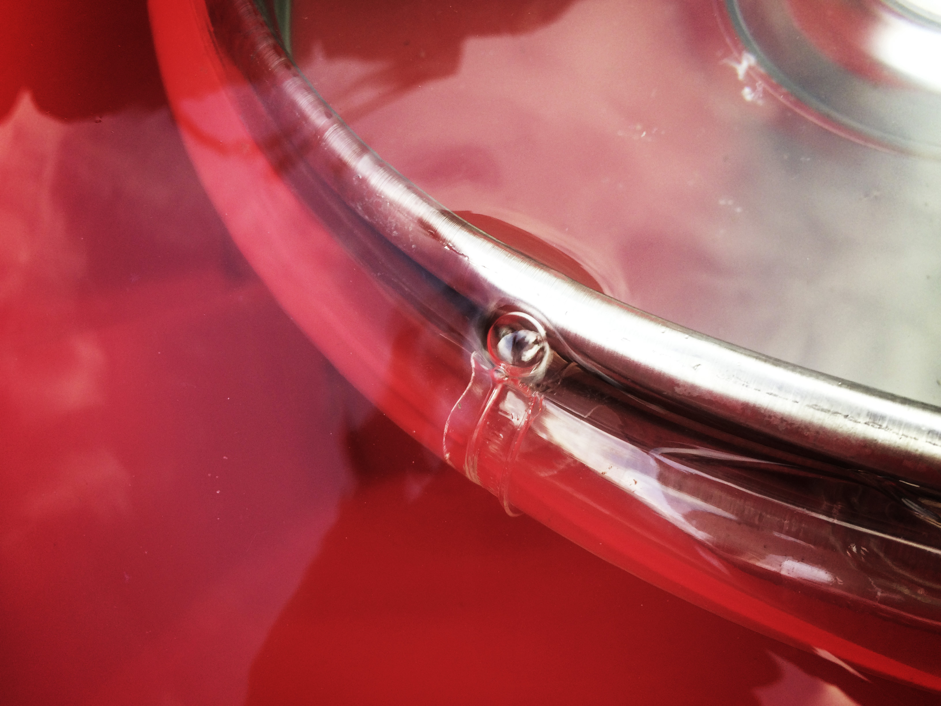 Eigentlich haben wir auf ein erstes Blubbern aus dem Innern des Tanks, auf das Einsetzen der Gärung gehofft, nun blubbert es ganz woanders… Nicht im Tank, sondern am Deckelrand: Der nigelnagelneue Gummischlauch am Tankdeckel, der das Behältnis luftdicht verschliessen soll, ist undicht, hat ein Loch an der unmöglichsten Stelle, direkt an der Naht. Eine schnelle Lösung muss her, um grösseren Schaden am Saft zu verhindern.
