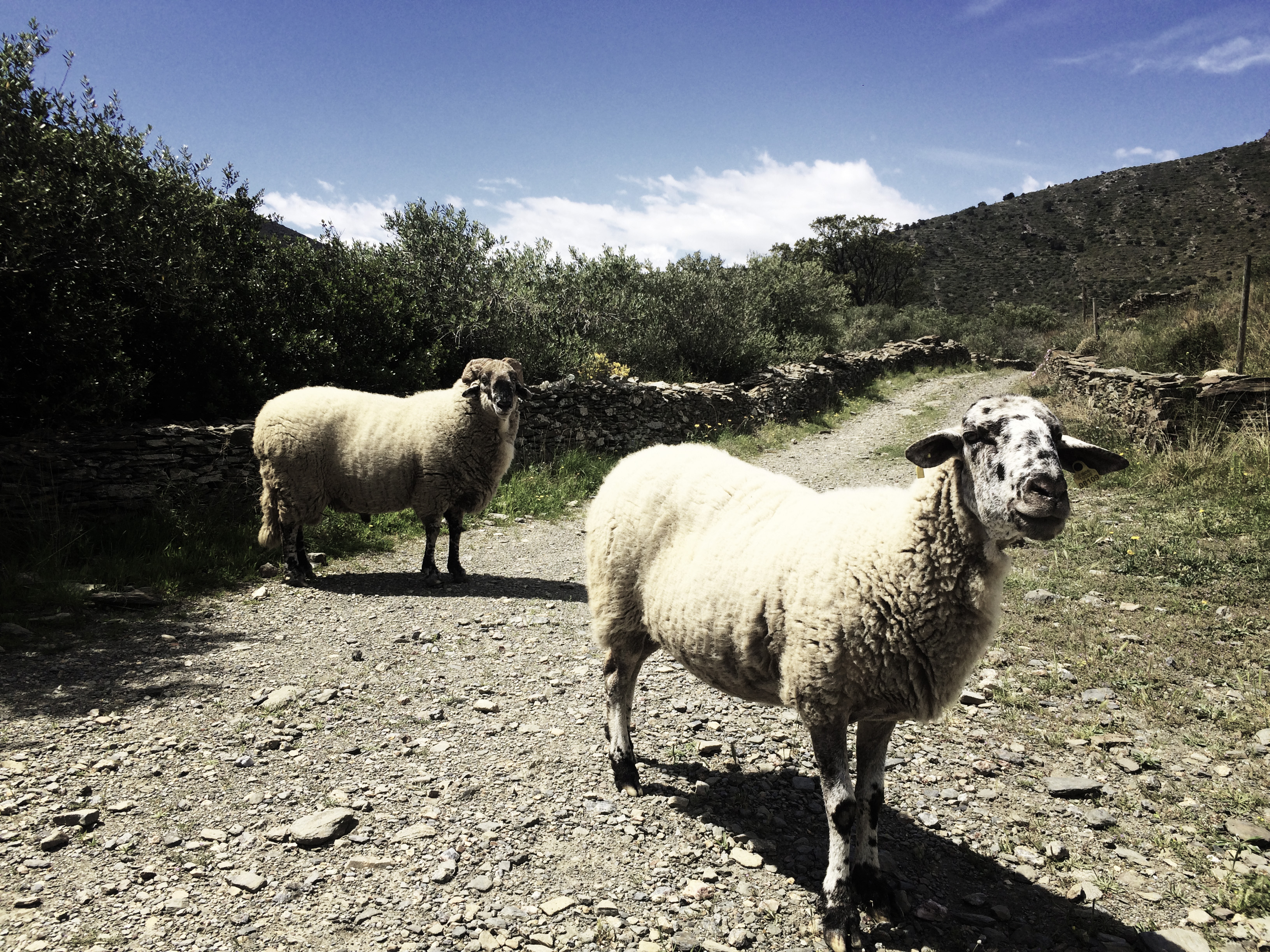 Kurzausflug nach Cadaques: Zwischen verschiedenen Baustellen müssen unbedingt die überzähligen Triebe von den Rebstöcken ausgebrochen werden. Dafür gibt’s nur ein kurzes Zeitfenster…: Zu früh getan, ist diese Arbeit meist umsonst, die Triebe wachsen sofort wieder nach, versucht man es zu spät, sind die jungen Triebe bereits verholzt, das Ausbrechen ist ohne die Pflanze zu schädigen fast nicht zu bewerkstelligen. Der Zeitpunkt ist perfekt erwischt und die Arbeit unter Beobachtung unbekannter, wohl irgendwo ausgebüxter, wolliger Gäste getan. Dann noch das Auto vollgepackt mit dem abgefüllten Wein und einigen Kisten Austern und ab, nach zwei Tagen Katalonien, wieder zurück in die Schweiz gedüst….