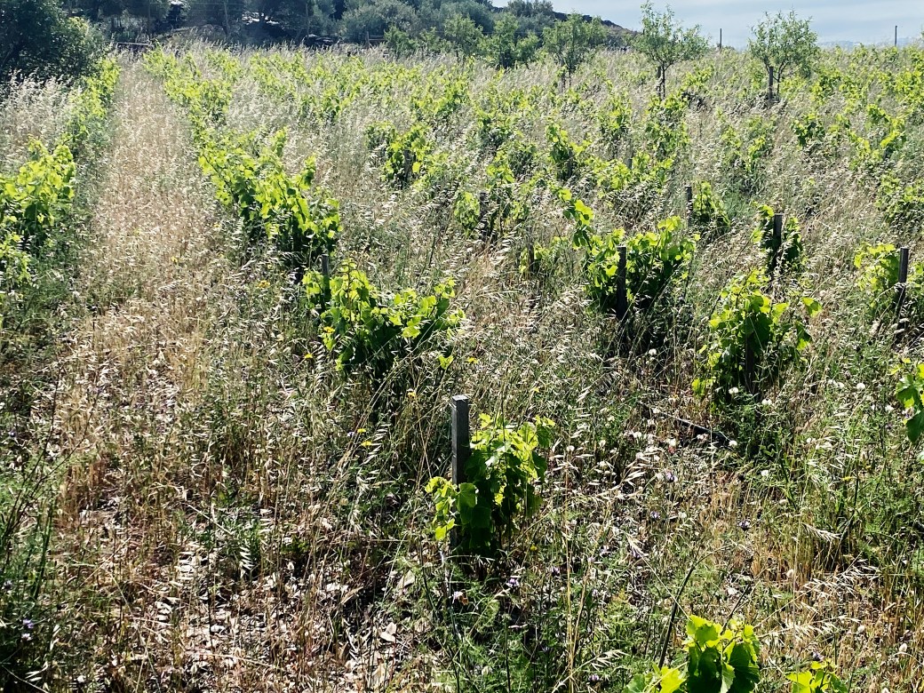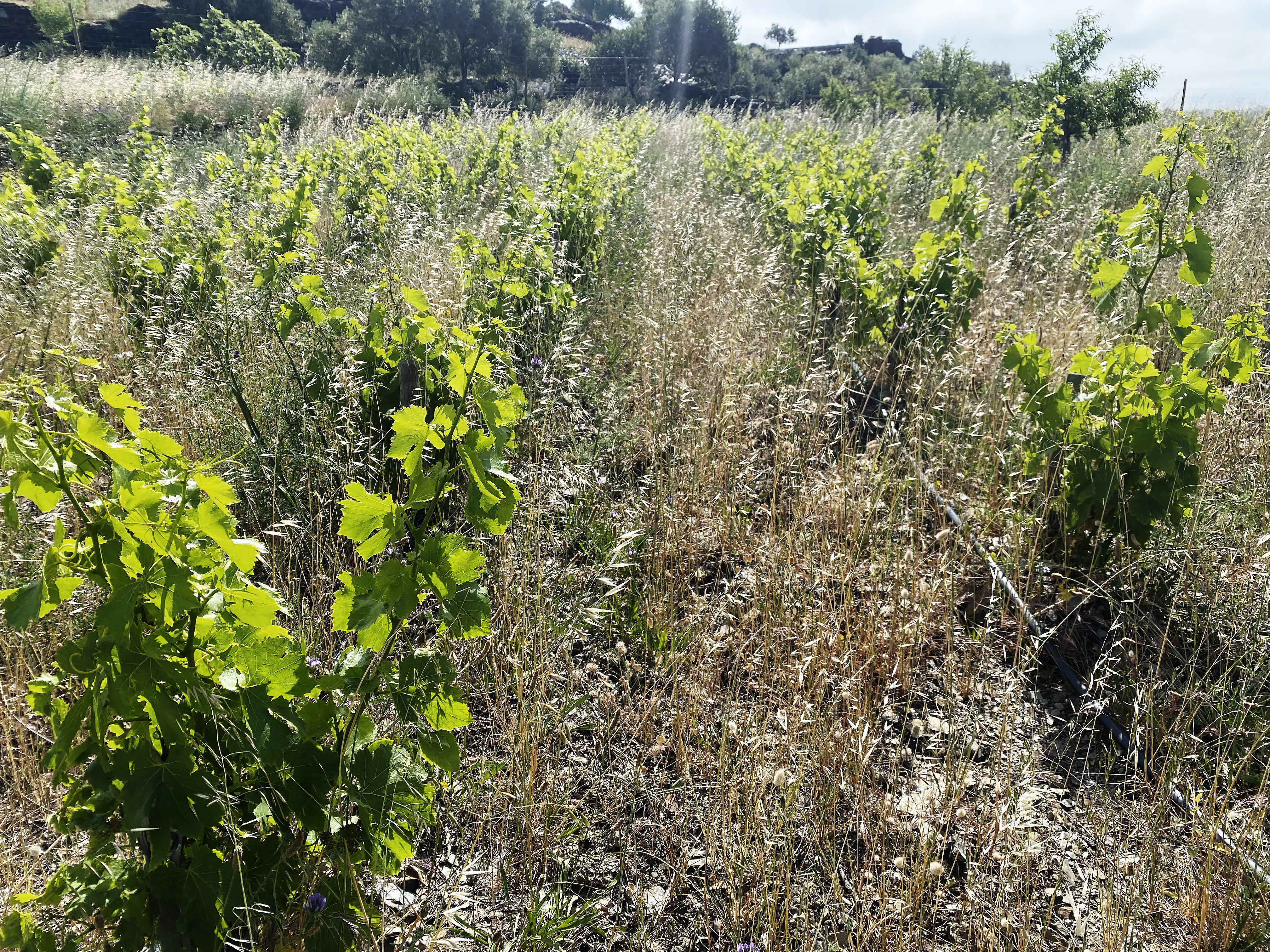 Der Sommer ist gekommen, das hohe Frühlingsgras beginnt bereits strohig braun zu werden, die Blüten konnten absamen und die Wiese wird nun kurzgemäht. Die frisch gepflanzten Reben verlangen ein erstes Mal nach Wasser nach den letzten sechs Wochen ohne Niederschlag. Nun gilt es bei den jungen Pflanzen zu jäten und damit alle Konkurrenten um das wenige Nass zu entfernen, das in den kommenden Monaten zur Verfügung stehen wird. Wir lassen so viel Mulch wie nur immer möglich um die Reben liegen, bedecken damit den nackten Boden und verhindern eine übermässige Verdunstung.