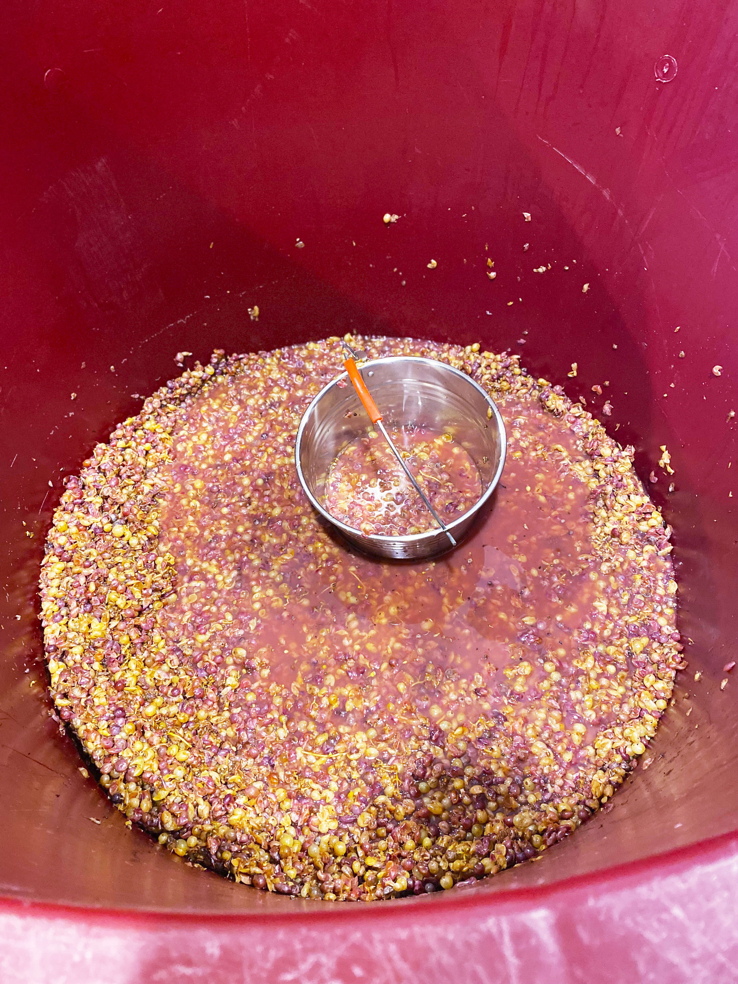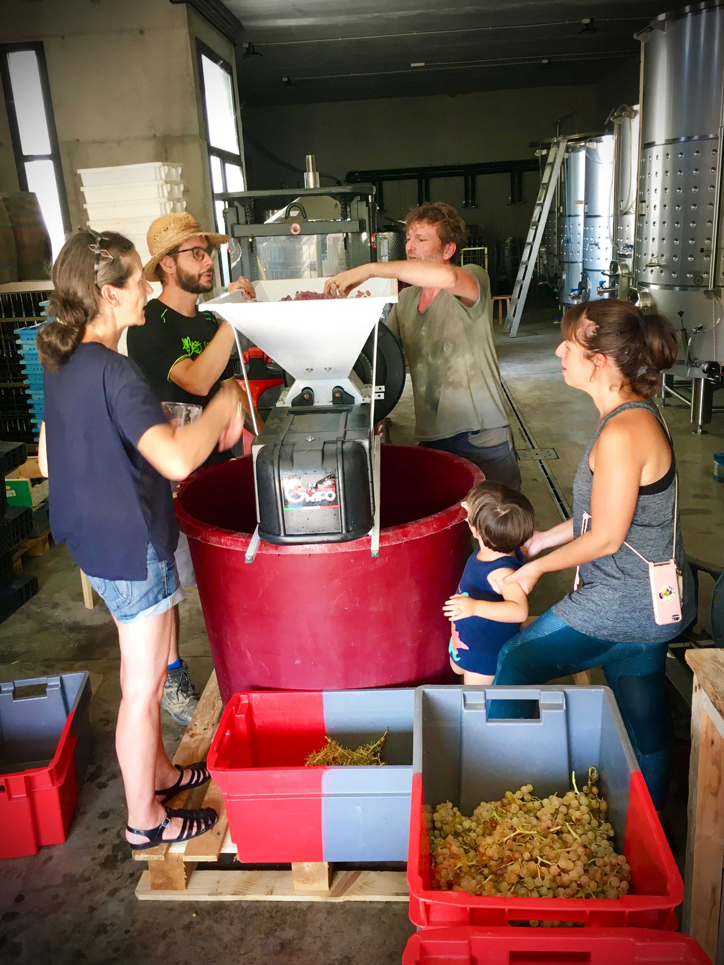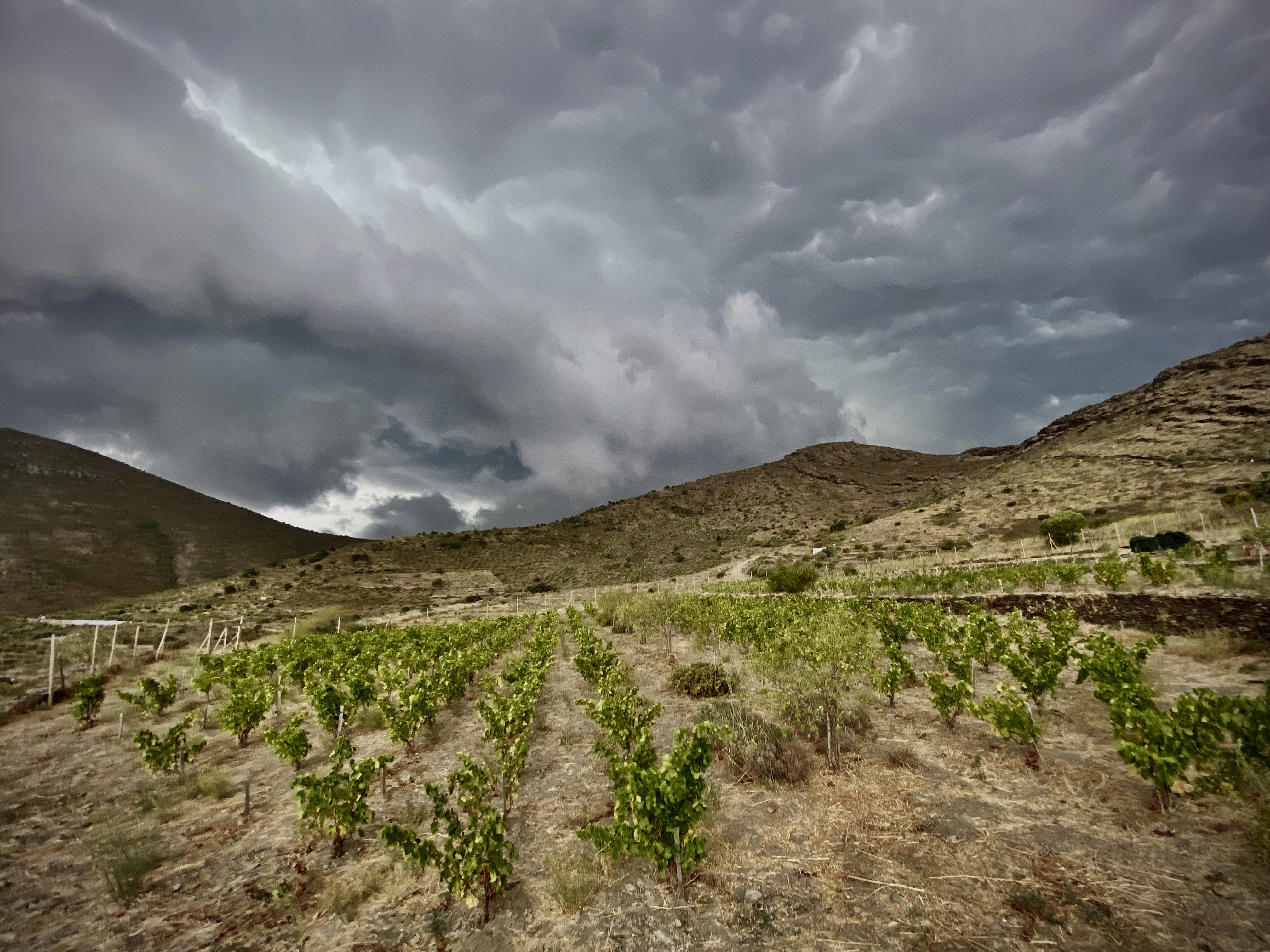 Ein Anruf von Freunden: die Trauben sind früher reif als erwartet… Alles verschieben, packen, ab ins Auto und in Begleitung des Vollmonds in Richtung Süden gedüst, die Erntekisten im Feld verteilt und am nächsten Morgen mit Scheren bewaffnet vor der grossen Hitze alle Früchte von den Reben geschnitten. Nach Rabos in den Keller damit, entrappen, quetschen, pressen, messen, in den Tank mit dem Saft, die Gärung kann beginnen. Danke Yves, danke Johanna für den Sprint! Kaum sind wir zurück aus dem Keller zieht ein Sommergewitter mit kräftigem Hagel über den Weinberg. Alles richtig gemacht…
