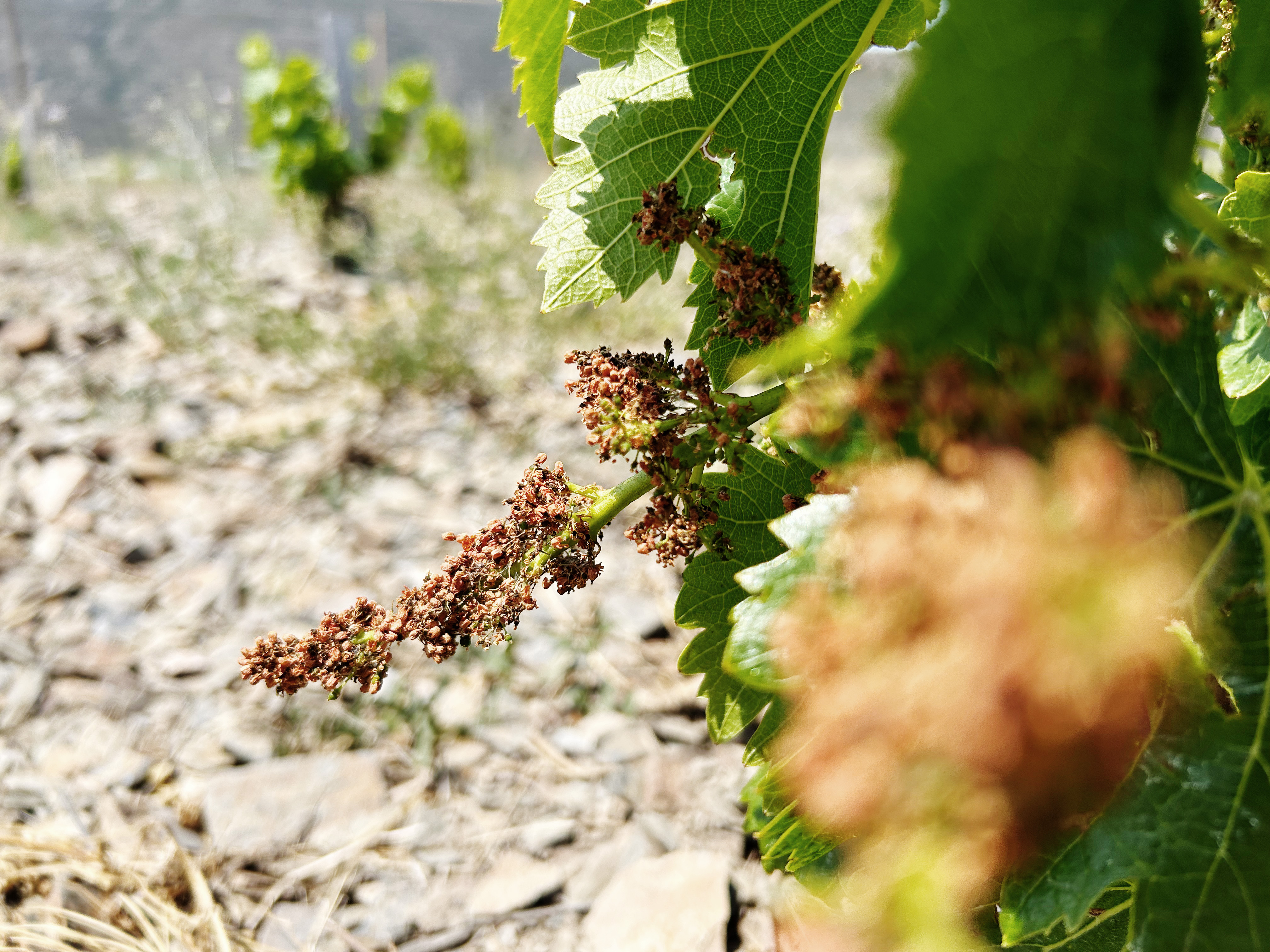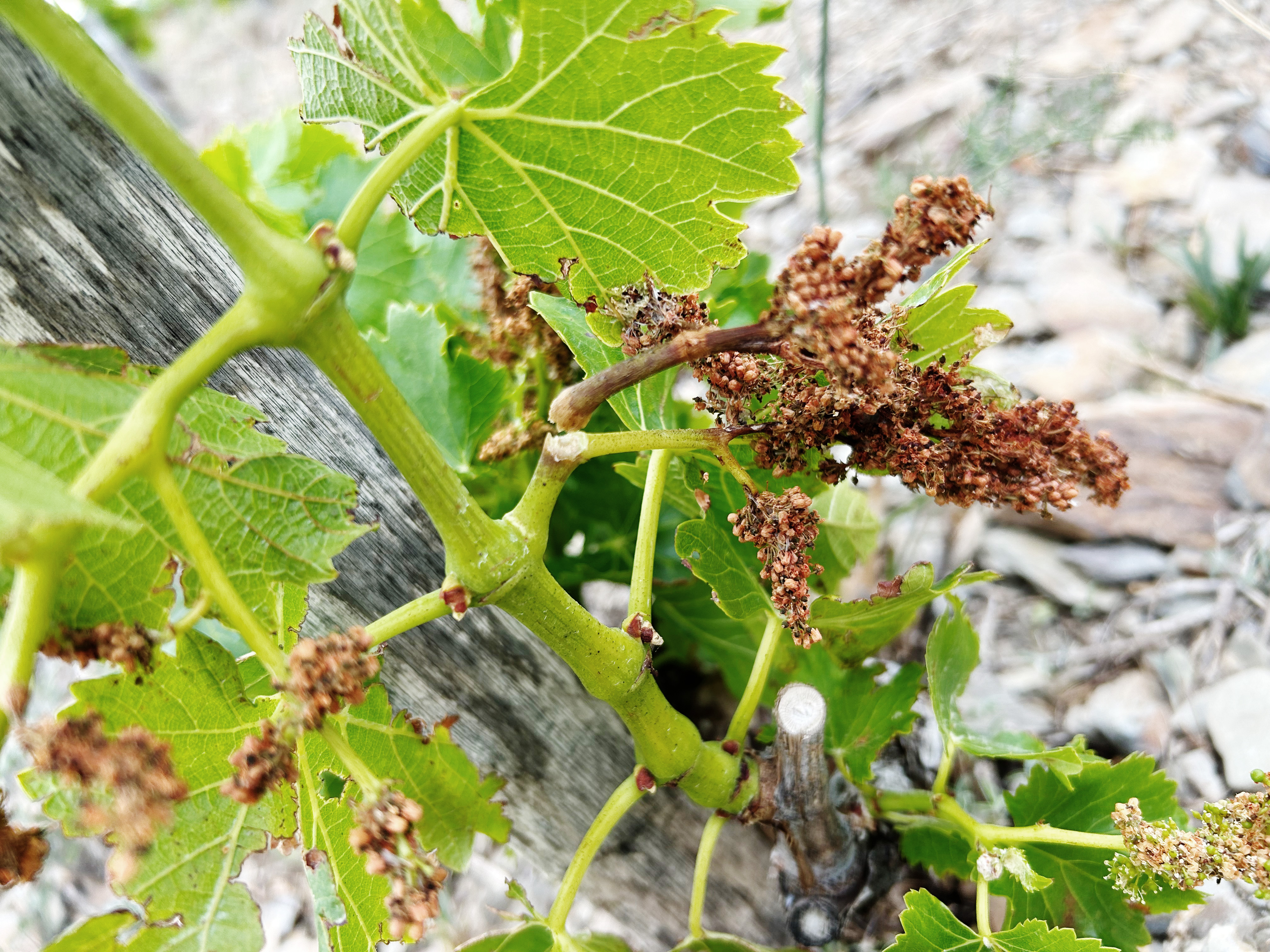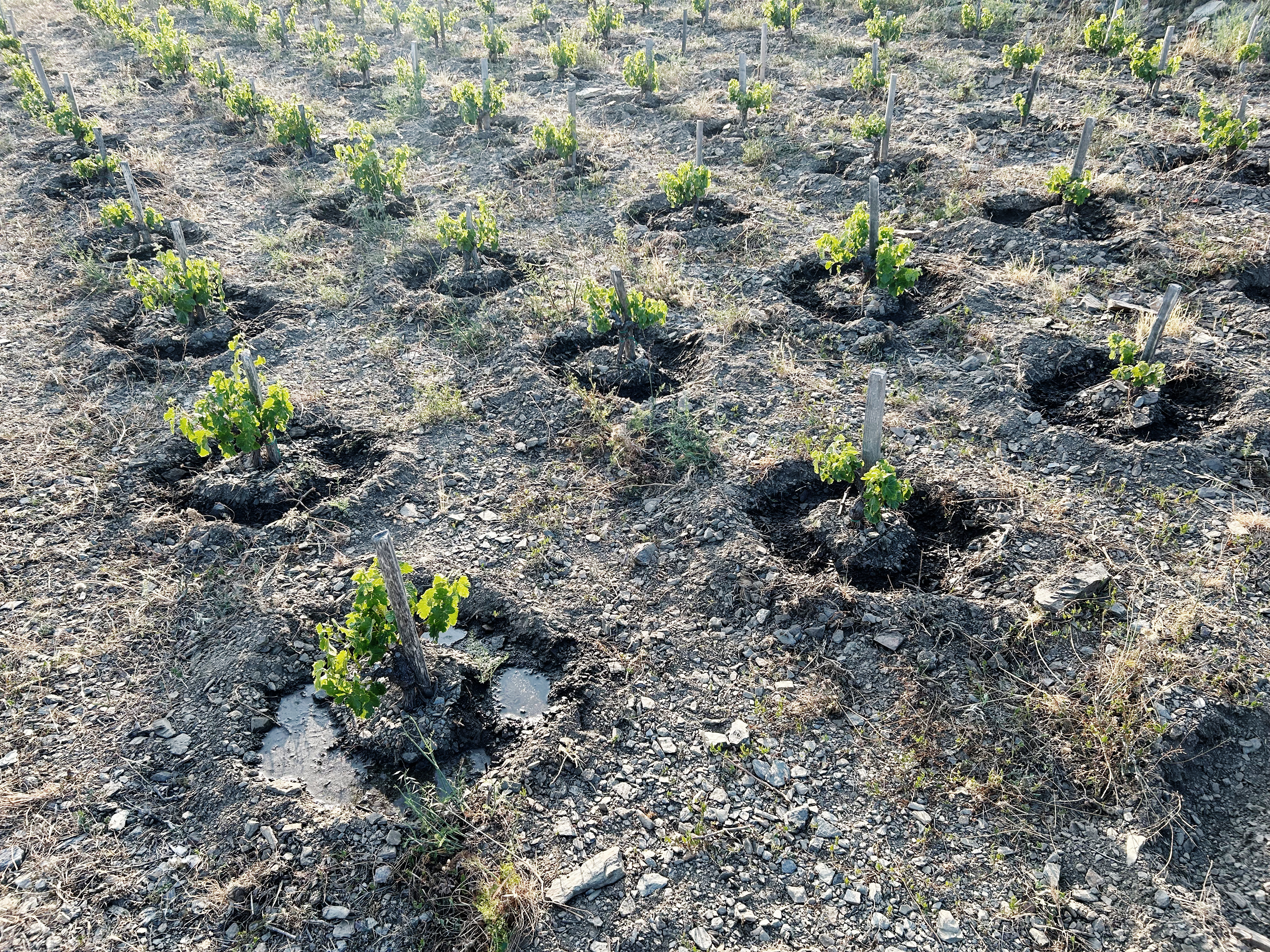 Der Regen bleibt aus, die Hitze drückt, die Reben leiden enorm und werfen ihre Blüten ab um sich vor dem Vertrocknen zu schützen. So verlieren wir bereits anfangs Sommer dreiviertel der Ernte. Wir versuchen nun alles um die Pflanzen zu retten, hacken um jede einzelne Pflanze kleine Gräben, die wir über Tage immer wieder mit Wasser füllen. Sollte trotz allem noch ein wenig Regen fallen, würde so das Wasser dank den Gräben auch da bleiben wo es hinsoll.