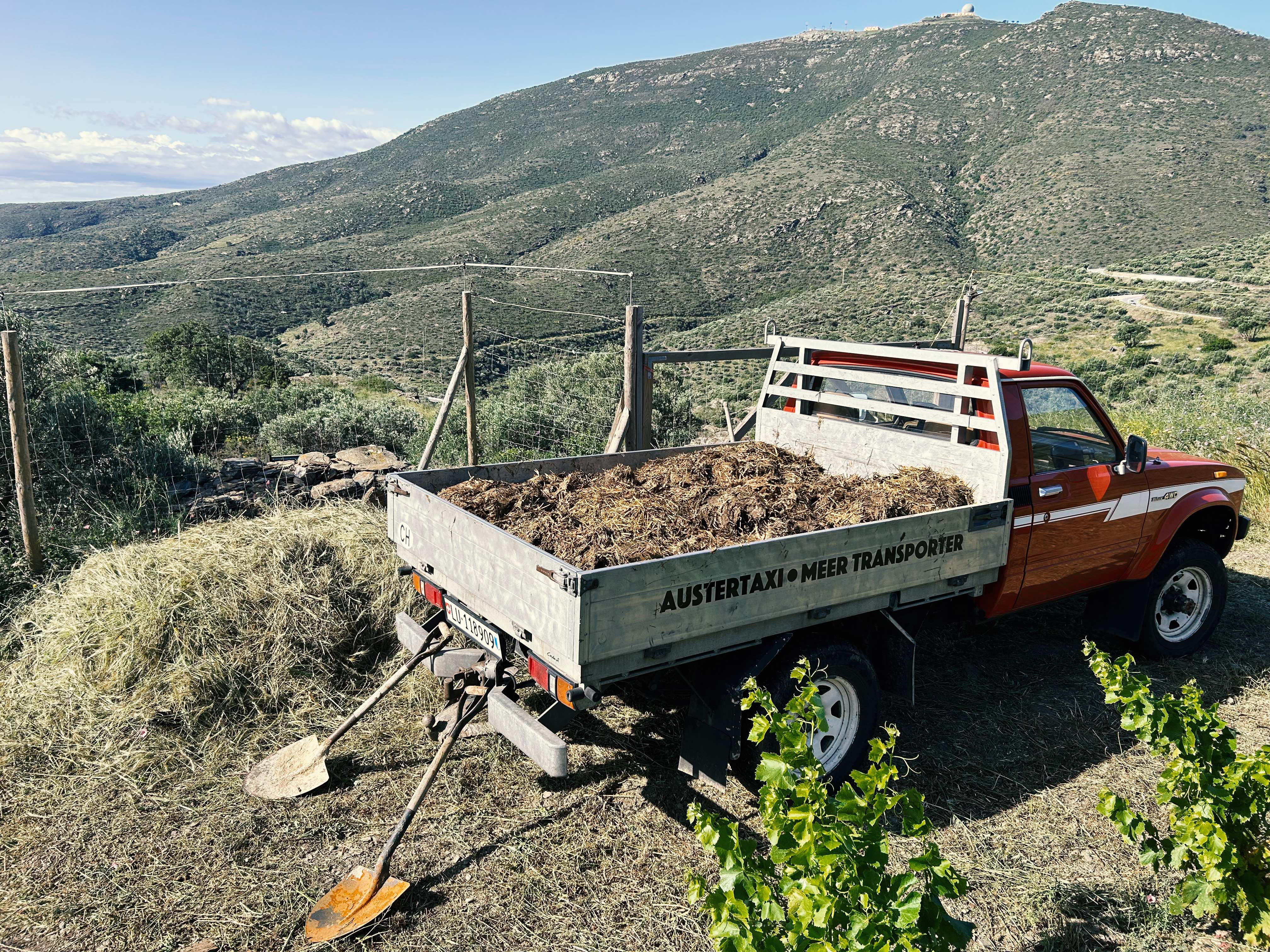 Wir nutzen jedes Gramm organisches Material und Mulchen den Weinberg um die Böden vor der Sommerhitze zu schützen. Karren tonnenweise Schafsdung her, versuchen alles um die durch die Dürre der letzten Jahre in Mitleidenschaft gezogenen Reben zu stärken. Es scheint zu wirken, die Reben blühen wunderbar und bilden zwar etwas spärlich, aber erstmals seit langem wieder schöne Früchte. Die Hoffnung ist zurück!