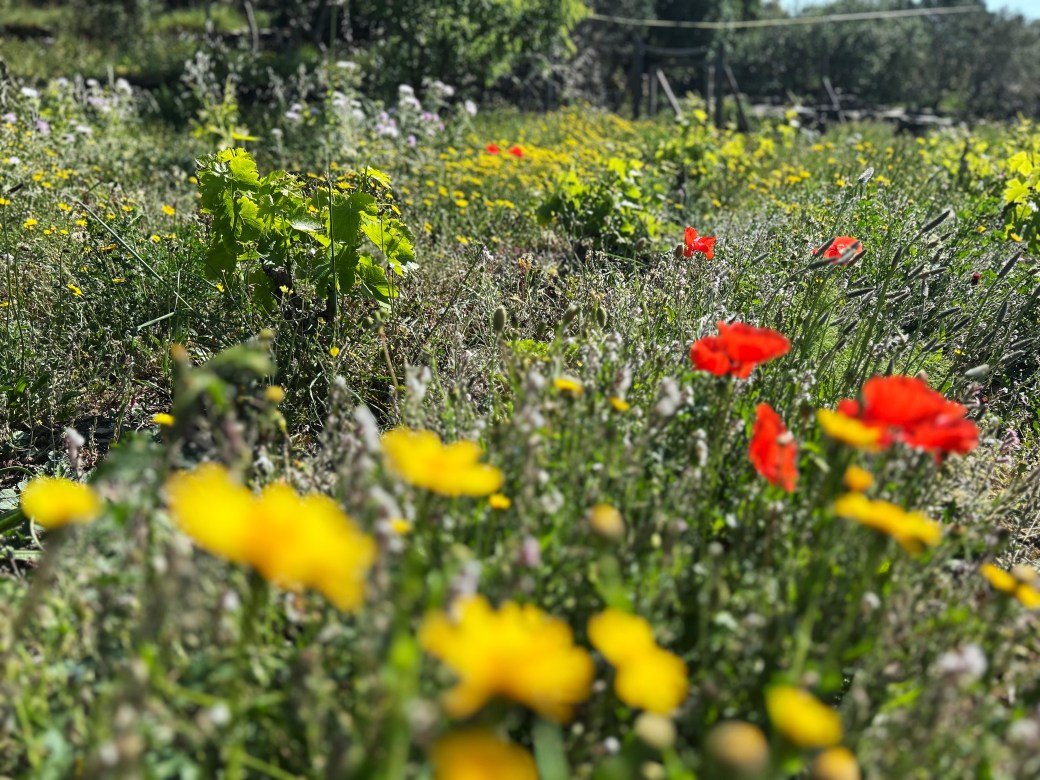 Der ganze Berg leuchtet in sattem Grün, im Weinberg blüht es in allen Farben. Die Reben haben wunderbar kräftige Triebe gebildet, und um den Pilzdruck in diesem ungewohnten Dickicht in Grenzen zu halten, brechen wir die überzähligen Triebe aus und hacken jede einzelne Pflanze frei von Bewuchs. In den Gassen lassen wir die Begrünung vorläufig noch stehen, damit sie ihre Samen abwerfen und im kommenden Jahr wieder keimen können.
