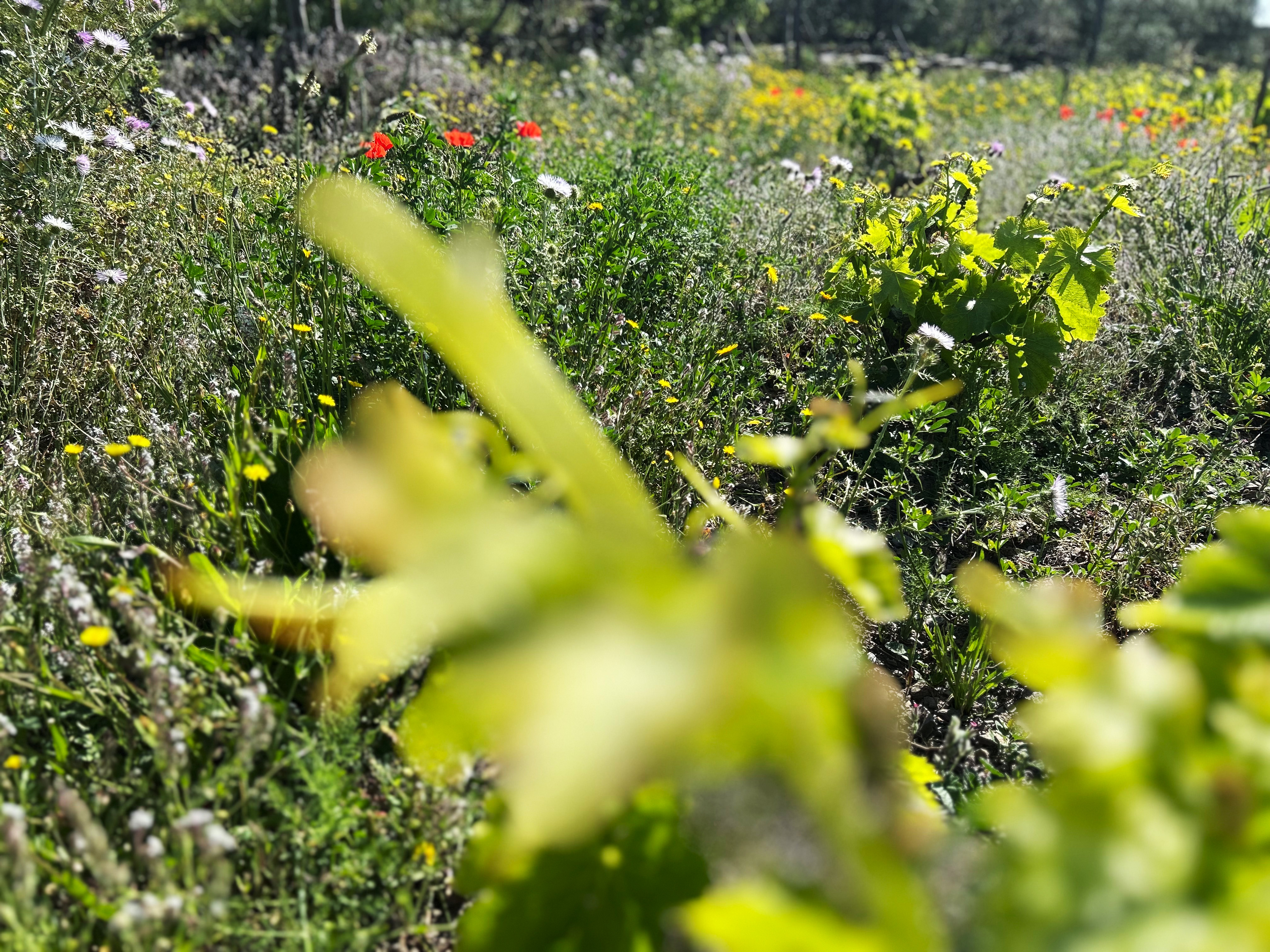 Der ganze Berg leuchtet in sattem Grün, im Weinberg blüht es in allen Farben. Die Reben haben wunderbar kräftige Triebe gebildet, und um den Pilzdruck in diesem ungewohnten Dickicht in Grenzen zu halten, brechen wir die überzähligen Triebe aus und hacken jede einzelne Pflanze frei von Bewuchs. In den Gassen lassen wir die Begrünung vorläufig noch stehen, damit sie ihre Samen abwerfen und im kommenden Jahr wieder keimen können.