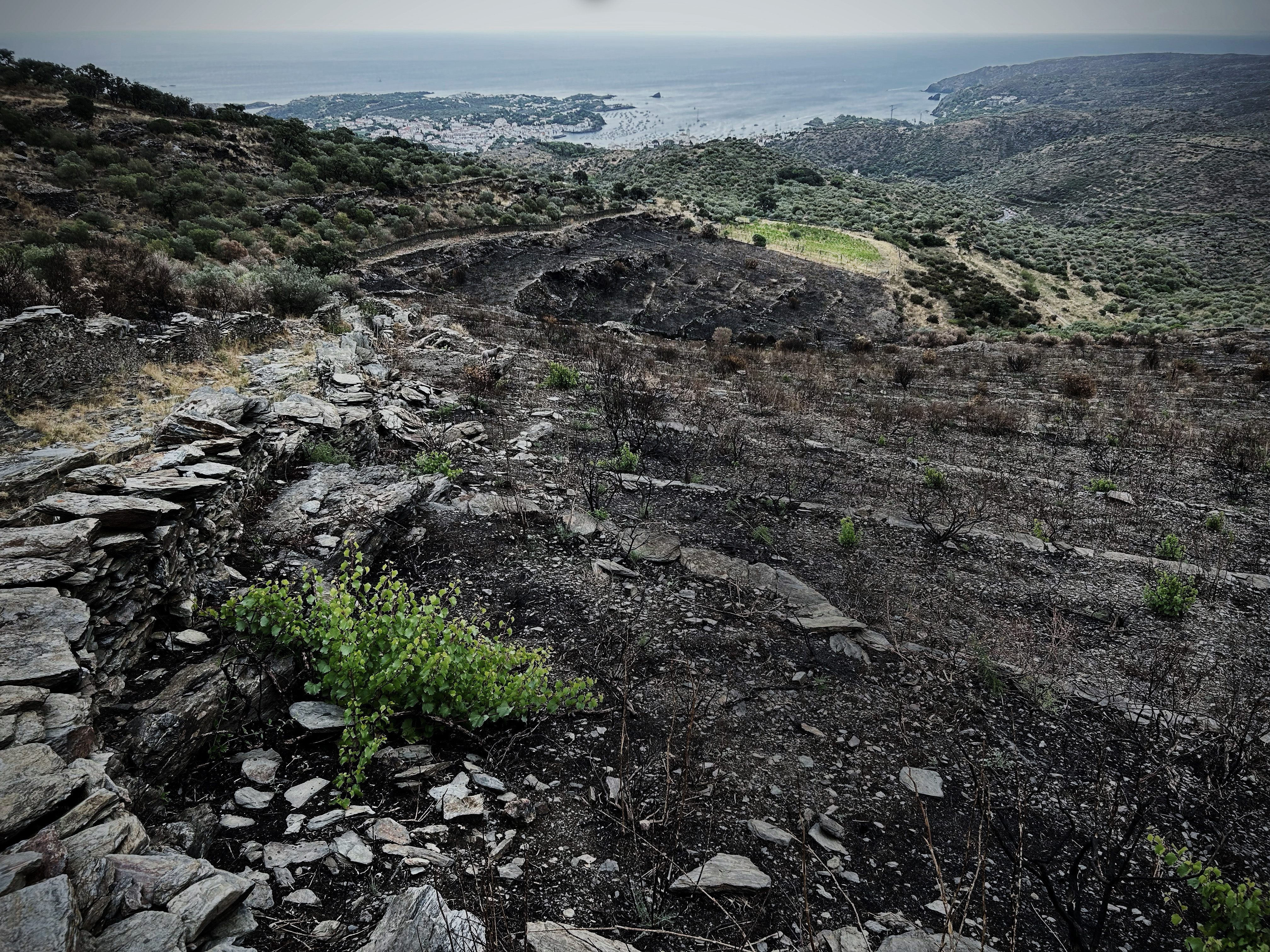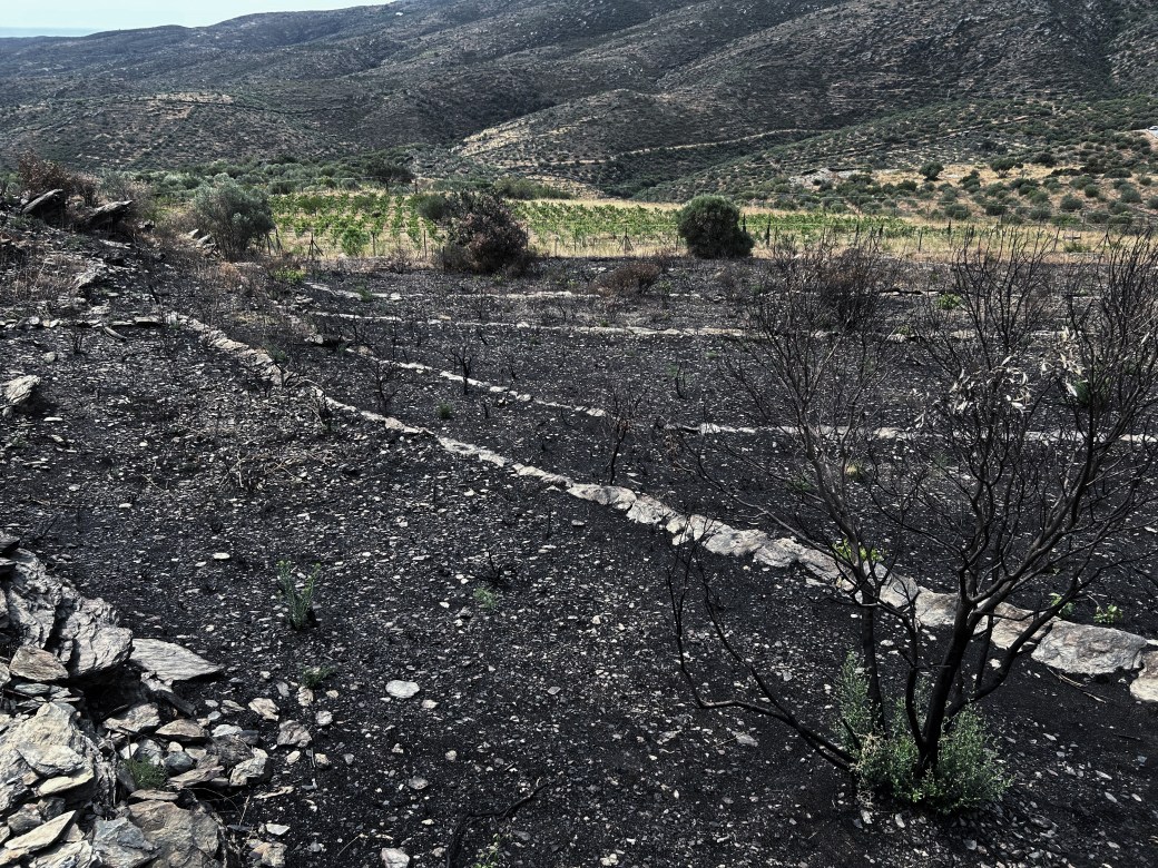 Der Wein ist am gären, wir wandern über den Berg um uns erstmals die Schäden des Feuers vom Juni genauer anzusehen. Die schwarzen Flächen haben etwas unwirklich Schönes, die uralten Terrassierungen stechen aus der Landschaft hervor und zeigen Eindrücklich die ursprüngliche Struktur des seit Jahren verbuschten Geländes. Unser Rebberg bildet eine kleine grüne Oase inmitten all der abgebrannten Fläche, uns wird unser unglaubliches Glück bewusst, und wir freuen uns erst Recht ab der diesjährigen Ernte.
